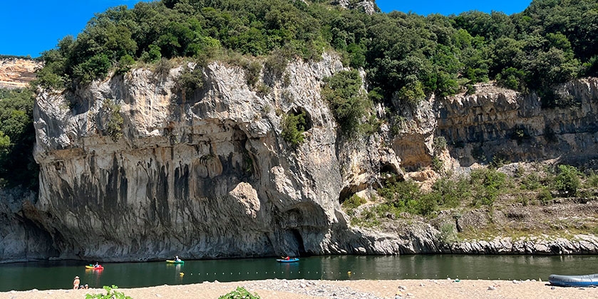 Dit terrein is zo indrukwekkend, gelegen tussen rotsformaties aan de Ardèche. Je voelt dan gelijk hoe klein we zijn op deze wereld. Ik werd op slag verliefd op dit gebied. Na zo’n anderhalf uur gewandeld te hebben ging ik aan de waterkant zitten, met mijn voeten in het water. Genieten van de vier elementen: voeten in het water, billen op de aarde, wind door de haren en het hete vuur van de zon op mijn rug. Als dit mijn laatste minuut was geweest, dan was ik heengegaan als de meest gelukkige mens ooit. Even genietend van deze elementen, en mijn broodje, voel ik opeens iets kriebelen aan mijn voeten en benen. Ik kijk naar het water en ik zie echt tientallen, misschien wel meer dan honderd, kleine visjes rond mijn voeten zwemmen. Ze kriebelen met hun staartjes tegen mijn ledematen. En sommigen proberen een hapje te nemen van mijn harige poten. Normaal gesproken eet ik de vis maar nu ziet het er naar uit dat ik gegeten wordt. Zou dit dan toch die laatste minuut zijn? Gelukkig valt het mee en laten ze toch nog wat over van mijn benen en voeten.